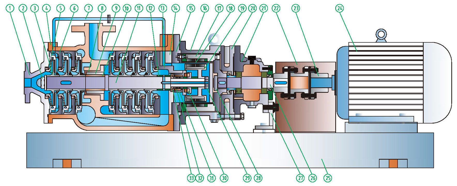 | ⑧ مقعد المحمل الأمامي | 304/316/316L | ⑲ مكون الدوار | مغناطيس دائم /304/316/316L | ㉚ طوق الدفع الخلفي | SSIC/سبائك صلبة |