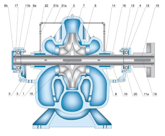 - **مضخة أحادية الشفط**: يدخل السائل إلى المروحة من جانب واحد؛ هيكل بسيط ولكنه عرضة للدفع المحوري.